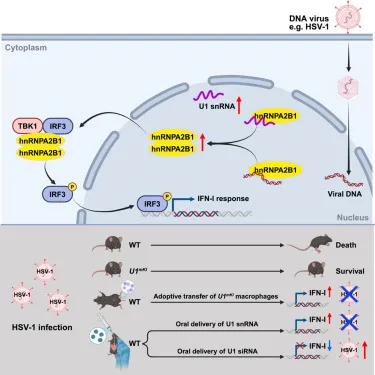 2025年10月22日,中国医学科学院苏州系统医学研究所马烽、江苏省碳基功能材料与器件高技术重点实验室Yin Lichen共同通讯在Cell Reports上在线发表题为“Nuclear U1 snRNA facilitates the dimerization of hnRNPA2B1 to enhance anti-DNA viral innate immunity”的研究论文。研究表明在DNA病毒HSV-1感染期间,七个U1基因和成熟的U1snRNA在核质中上调。U1的过表达在体外和体内促进了针对HSV-1感染的抗病毒免疫,而通过口服递送siRNA敲低U1会减弱小鼠的抗DNA病毒反应。