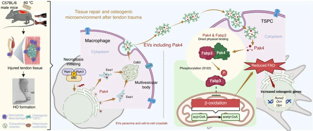 2025年10月25日,上海交通大学阮洪江、范存义及Li Juehong共同通讯在Bone Research 在线发表题为“Pak4-mediated crosstalk between necroptotic macrophages and tendon stem/progenitor cells contributes to traumatic heterotopic ossification formation”的研究论文,该研究通过小鼠体内烧伤/肌腱切断模型和体外肌腱干/祖细胞(TSPCs)成骨分化模型,结合转基因敲除、基因敲除、转录组和蛋白质组测序、质谱、共免疫沉淀等技术,揭示了一种新的p21活化激酶4 (Pak4)介导的窜扰,其中坏死巨噬细胞通过减少脂肪酸β-氧化(FAO)激发TSPCs。在HO形成过程中促进异常成骨分化。与WT小鼠相比,Mlkl敲除(C57BL/6JGpt-Mlklem1Cd1679/Gpt)阻断坏死性凋亡可显著降低HO。