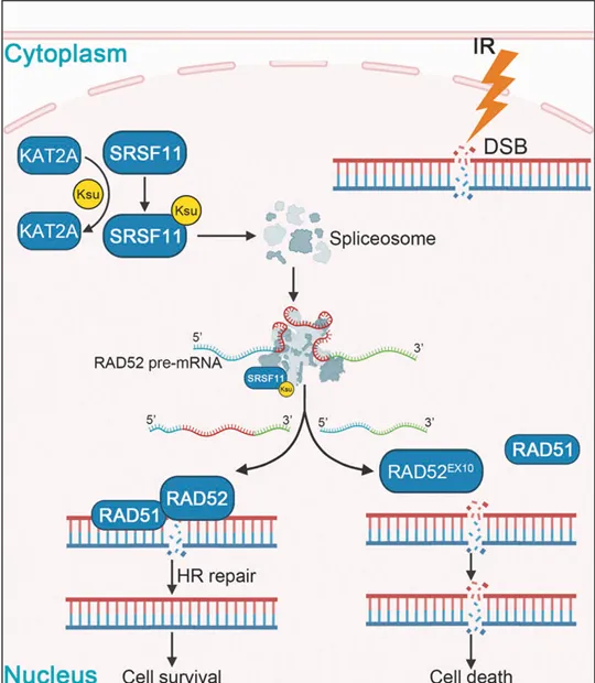 2025年11月7日,四川大学杨家印、石毓君及吕涛共同通讯在Signal Transduction and Targeted Therapy 在线发表题为“KAT2A-driven succinylation of SRSF11 enforces spliceosome-mediated RAD52 splicing to promote homologous recombination and radioresistance in hepatocellular carcinoma”的研究论文,该研究系统地证明了剪接因子SRSF11在HCC进展中发生了功能性的琥珀酰化。在机制上,赖氨酸乙酰转移酶2A (KAT2A)直接与SRSF11相互作用,催化其在赖氨酸419位点(K419)的琥珀酰化,从而增强体外和体内肝癌模型的DNA损伤修复能力。
