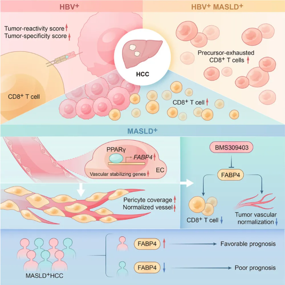 2025年11月6日,哈尔滨医科大学郝大鹏,邰升和郑桐森共同通讯在Journal of Hepatology 在线发表题为“An etiology-stratified single-cell atlas identifies FABP4 as a prognostic marker for MASLD-related HCC”的研究论文。该研究比较了不同病因HCC患者的预后,发现HBV+MASLD+ HCC患者在免疫治疗后表现出最佳的临床结局。与MASLD- HCC相比,MASLD+ HCC显示出CD8+ T细胞浸润增加和巨噬细胞丰度降低。在HBV+ HCC中,肿瘤反应性及肿瘤特异性T细胞评分、耗竭标志物表达以及M1型巨噬细胞特征均显著高于HBV- 病例。