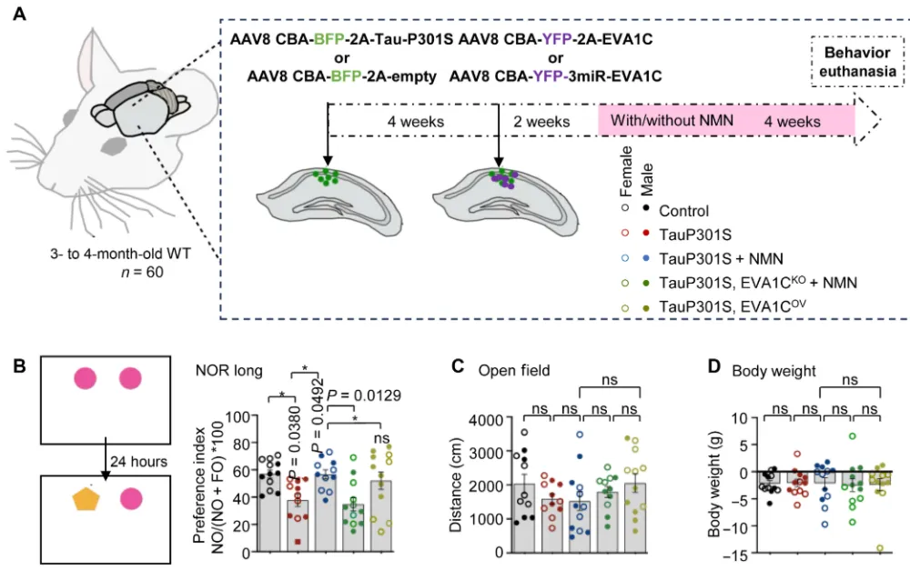 2025年11月7日,暨南大学罗钧洪,挪威奥斯陆大学和阿克舒斯大学Evandro Fei Fang和葡萄牙米尼奥大学Joana Margarida Silva共同通讯在Science Advances 在线发表题为“NAD+ reverses Alzheimer’s neurological deficits via regulating differential alternative RNA splicing of EVA1C”的研究论文。该研究显示,NAD+可通过一种关键蛋白EVA1C(上皮V样抗原1同源蛋白C)纠正多基因的选择性剪接异常,该蛋白参与神经元发育及功能活动。