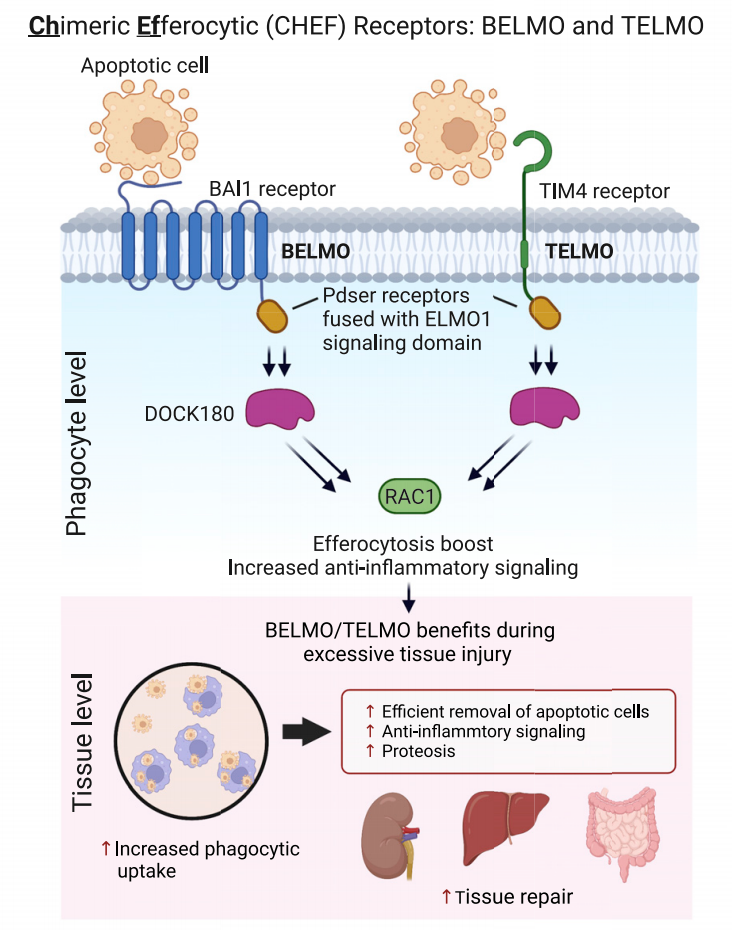 本研究开发了一种嵌合细胞受体BELMO,突破先前胞葬作用调控的局限,可以更为高效地促进胞葬作用,清除凋亡细胞,降低炎症水平,在多种疾病模型具有局部保护作用。