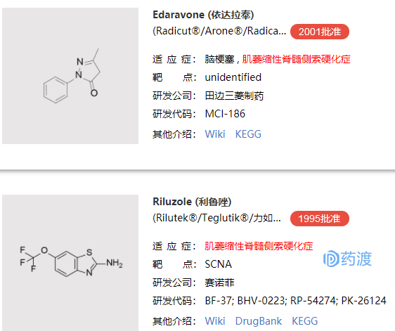ALS又被称为“渐冻人症”,是一种能够导致四肢、躯干、胸腹部肌肉逐渐无力和萎缩的渐进式神经退行性疾病。患者从刚开始的疲劳无力发展到后期的吞咽困难、呼吸衰竭,现上市治疗ALS的药物如下图所示。
