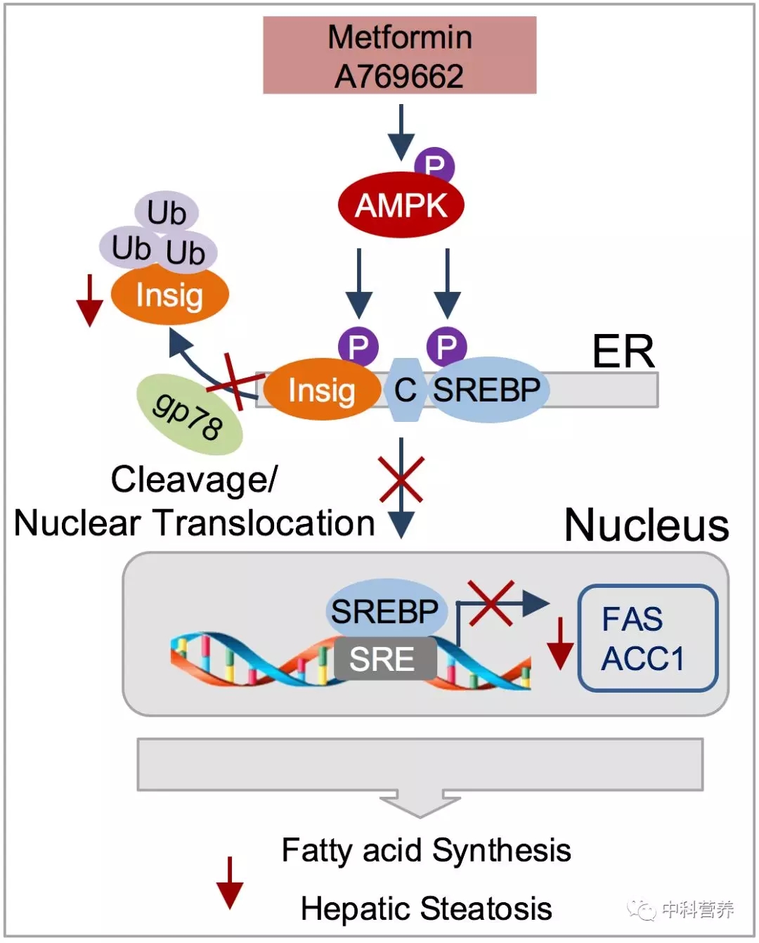图:AMPK通过磷酸化修饰Insig调节脂肪酸合成。二甲双胍、A769662等在激活AMPK的情况下,能够磷酸化Insig-1 Thr222位点,抑制其与E3泛素连接酶gp78的相互作用,降低泛素化水平,从而增加蛋白稳定性,抑制SREBP的剪切和活化,进一步抑制脂质合成基因表达和肝脏脂肪酸合成,改善肝脏脂质沉积和脂肪肝。该研究揭示了蛋白质翻译后修饰通过泛素化降解途径调节脂肪酸合成的新机制,为临床中治疗非酒精性脂肪肝和相关代谢性疾病提供了新靶点和新思路。